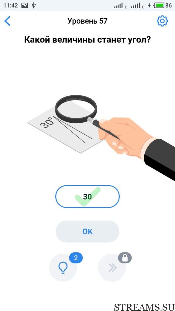 Какой величины станет угол? 57 уровень Easy Game — это интересная но в тоже время сложная головоломка, которая заставит вас включить нестандартное мышление. Прокачайте свой мозг и IQ. Почувствуйте себя самым умным, решая захватывающие и заковыристые задачки. Разработчики Easybrain, обещают, что с помощью этой игры вы сможете развить творческие навыки. Но если не сможете пройти какой-нибудь из уровней, то воспользуйтесь ответами с нашего сайта.