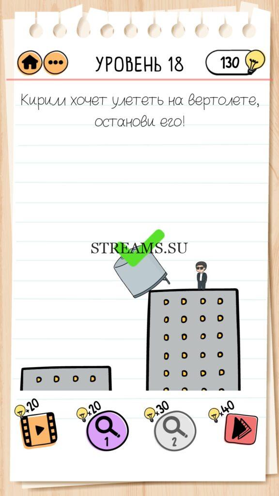 Кирилл хочет улететь на вертолете, останови его! Уровень 18 — Brain Test 2 (Агент Беймс Джонд): Вторая часть замечательной игры уже здесь. Готовы к испытанию своего мозга на прочность? Тогда смело залетайте в эту головоломку. Здесь нас ждет непредсказуемые задачки, вопросы и головоломки, которые сразу и не получиться решить. Будьте готовы к вопросам с подвохом! Попробуйте решить все уровни. Эта головоломка построена по принципу историй. В каждой истории придется помогать кому-то решить бытовые вопросы; вычислить преступника; помочь похудеть. Это лишь некоторые эпизоды которые нас ожидают в этой игре. Очень красочная игра, которая понравится и вам и вашим друзьям. Если не получается пройти загадку, то на нашем сайте STREAMS.SU вы найдете решение любого уровня Brain Test 2!