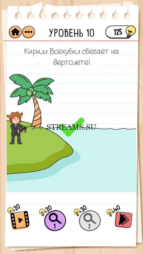 Кирилл Всехубил сбегает на вертолете! Уровень 10 — Brain Test 2: Вторая часть замечательной игры уже здесь. Готовы к испытанию своего мозга на прочность? Тогда смело залетайте в эту головоломку. Здесь нас ждет непредсказуемые задачки, вопросы и головоломки, которые сразу и не получиться решить. Будьте готовы к вопросам с подвохом! Попробуйте решить все уровни. Эта головоломка построена по принципу историй. В каждой истории придется помогать кому-то решить бытовые вопросы; вычислить преступника; помочь похудеть. Это лишь некоторые эпизоды которые нас ожидают в этой игре. Очень красочная игра, которая понравится и вам и вашим друзьям. Если не получается пройти загадку, то на нашем сайте STREAMS.SU вы найдете решение любого уровня Brain Test 2!