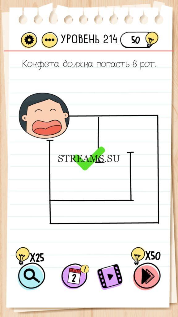 Конфетка должна попасть в рот. Уровень 214 — Brain Test — Это самая популярная головоломка, в которой вам предстоит разгадывать непростые задачки. Нужно будет искать нестандартные решения. Название игры говорит само за себя (Тест мозга). С её помощью вы сможете повысить свой IQ, и интеллект. Иногда ответ может быть очень прост. Вы можете играть в компании друзей или родных. Брейн Тест, это отличный способ провести время с пользой и узнать насколько ты умный. Но если вы не можете решить один или несколько уровней, то воспользуйтесь подсказками с нашего сайта.