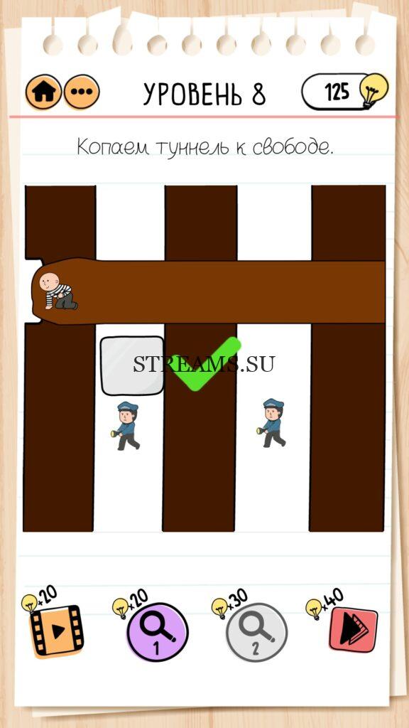 Копаем туннель к свободе. Уровень 8 — Brain Test 2 (Побег из тюрьмы): Вторая часть замечательной игры уже здесь. Готовы к испытанию своего мозга на прочность? Тогда смело залетайте в эту головоломку. Здесь нас ждет непредсказуемые задачки, вопросы и головоломки, которые сразу и не получиться решить. Будьте готовы к вопросам с подвохом! Попробуйте решить все уровни. Эта головоломка построена по принципу историй. В каждой истории придется помогать кому-то решить бытовые вопросы; вычислить преступника; помочь похудеть. Это лишь некоторые эпизоды которые нас ожидают в этой игре. Очень красочная игра, которая понравится и вам и вашим друзьям. Если не получается пройти загадку, то на нашем сайте STREAMS.SU вы найдете решение любого уровня Brain Test 2!