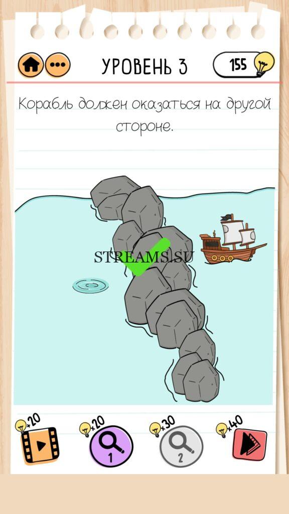 Корабль должен оказаться на другой стороне. Уровень 3 — Brain Test 2 (Капитан Маша): Вторая часть замечательной игры уже здесь. Готовы к испытанию своего мозга на прочность? Тогда смело залетайте в эту головоломку. Здесь нас ждет непредсказуемые задачки, вопросы и головоломки, которые сразу и не получиться решить. Будьте готовы к вопросам с подвохом! Попробуйте решить все уровни. Эта головоломка построена по принципу историй. В каждой истории придется помогать кому-то решить бытовые вопросы; вычислить преступника; помочь похудеть. Это лишь некоторые эпизоды которые нас ожидают в этой игре. Очень красочная игра, которая понравится и вам и вашим друзьям. Если не получается пройти загадку, то на нашем сайте STREAMS.SU вы найдете решение любого уровня Brain Test 2!