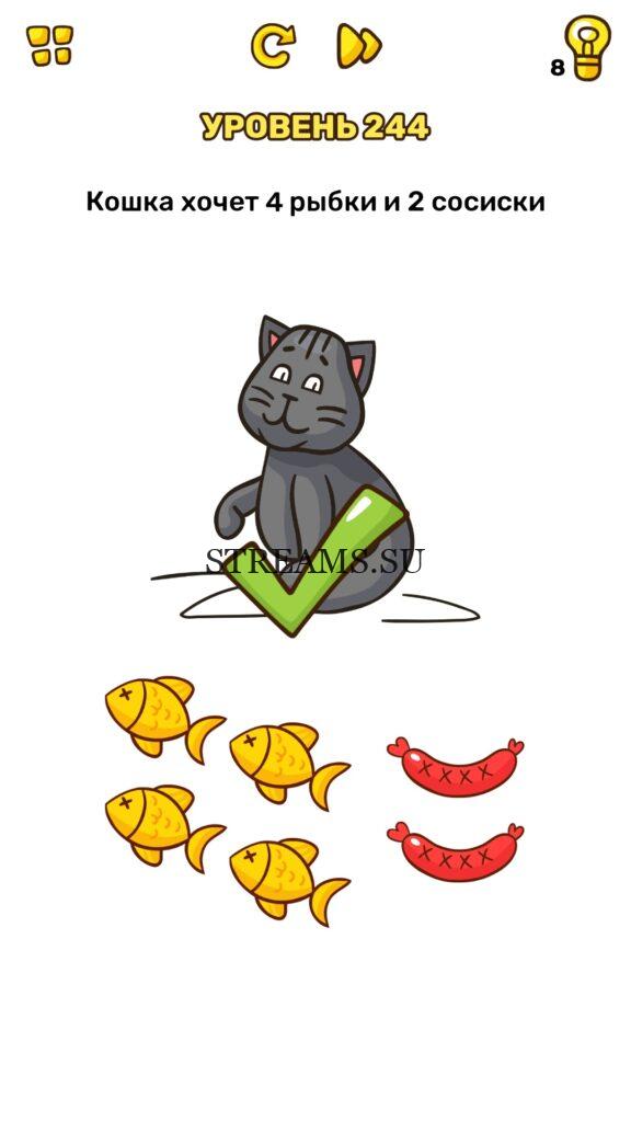 Кошка хочет 2 рыбки и 4 сосиски. Уровень 244 — Brain Blow: Тест на гениальность — Ответ на этот уровень находится под фото. Очередная игра от популярных разработчиков головоломок CASUAL AZUR GAMES. Если вы хотите взорвать свой мозг и развить навыки нестандартного мышления, тогда игра Брейн Блоу определенно вам понравится. Если не получается решить задание, то попробуйте включить нестандартное мышление, тряхнуть телефон, погладить его или использовать больше пальцев. Эта игра способна развить в вас навыки следопыта, креативность и прокачать ваш IQ. Но, а если все-же не получается пройти уровень, найдите правильное решение на нашем сайте.