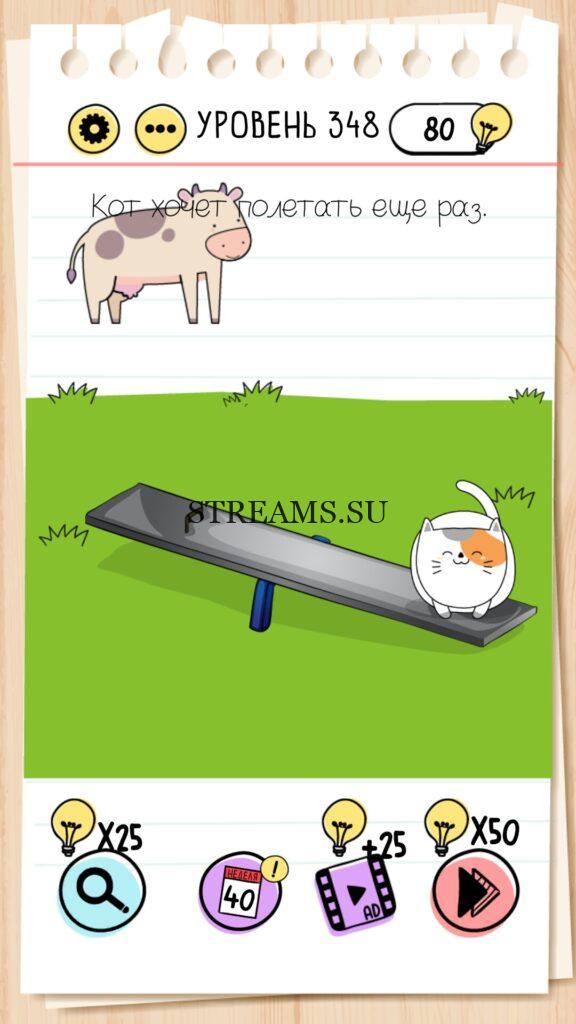 Кот хочет полетать ещё раз. Уровень 348 — Brain Test — Это самая популярная головоломка, в которой вам предстоит разгадывать непростые задачки. Нужно будет искать нестандартные решения. Название игры говорит само за себя (Тест мозга). С её помощью вы сможете повысить свой IQ, и интеллект. Иногда ответ может быть очень прост. Вы можете играть в компании друзей или родных. Брейн Тест, это отличный способ провести время с пользой и узнать насколько ты умный. Но если вы не можете решить один или несколько уровней, то воспользуйтесь подсказками с нашего сайта.