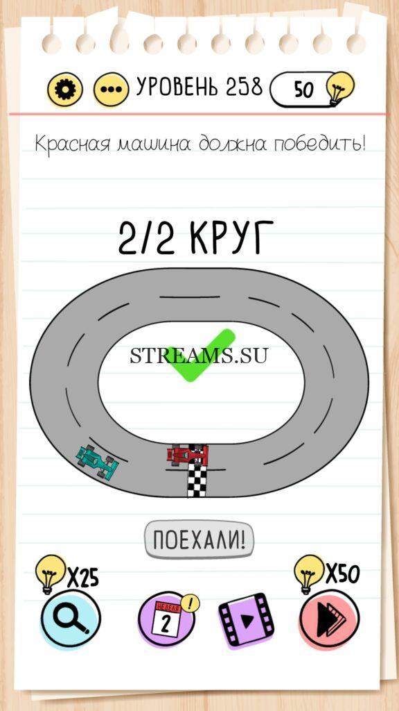 Красная машина должна победить! Уровень 258 — Brain Test — Это самая популярная головоломка, в которой вам предстоит разгадывать непростые задачки. Нужно будет искать нестандартные решения. Название игры говорит само за себя (Тест мозга). С её помощью вы сможете повысить свой IQ, и интеллект. Иногда ответ может быть очень прост. Вы можете играть в компании друзей или родных. Брейн Тест, это отличный способ провести время с пользой и узнать насколько ты умный. Но если вы не можете решить один или несколько уровней, то воспользуйтесь подсказками с нашего сайта.