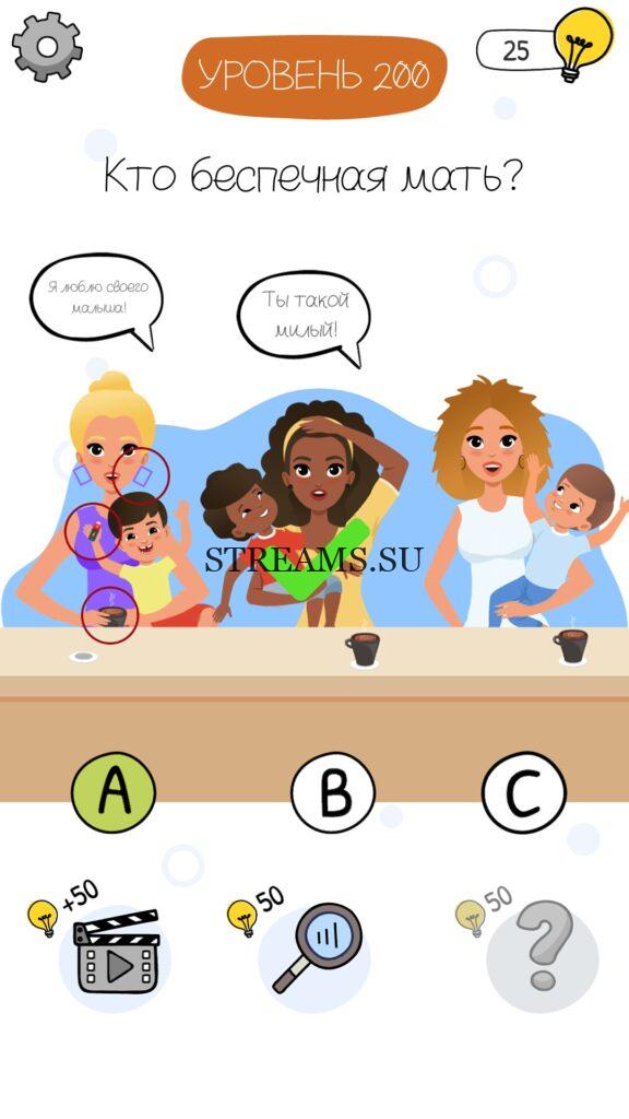 Кто беспечная мать? Уровень 200 — Who is? Головоломки и загадки — это уникальная головоломка, с которой не соскучишься! Если вам понравились такие игры как Brain Test и вторая её часть, то вам придется по вкусу и эта игра. С помощью подсказок, которые нам предстоит найти, нужно проходить уровень за уровнем. С каждым уровнем сложность отгадки будет расти. Поэтому приготовьтесь попотеть, чтобы пройти все уровни. Преимущества этой игры в том, что она работает без интернета! Если у вас не получается пройти один из уровней, то не отчаивайтесь. Вы всегда сможете найти ответы к игре Who is? на нашем замечательном сайте!