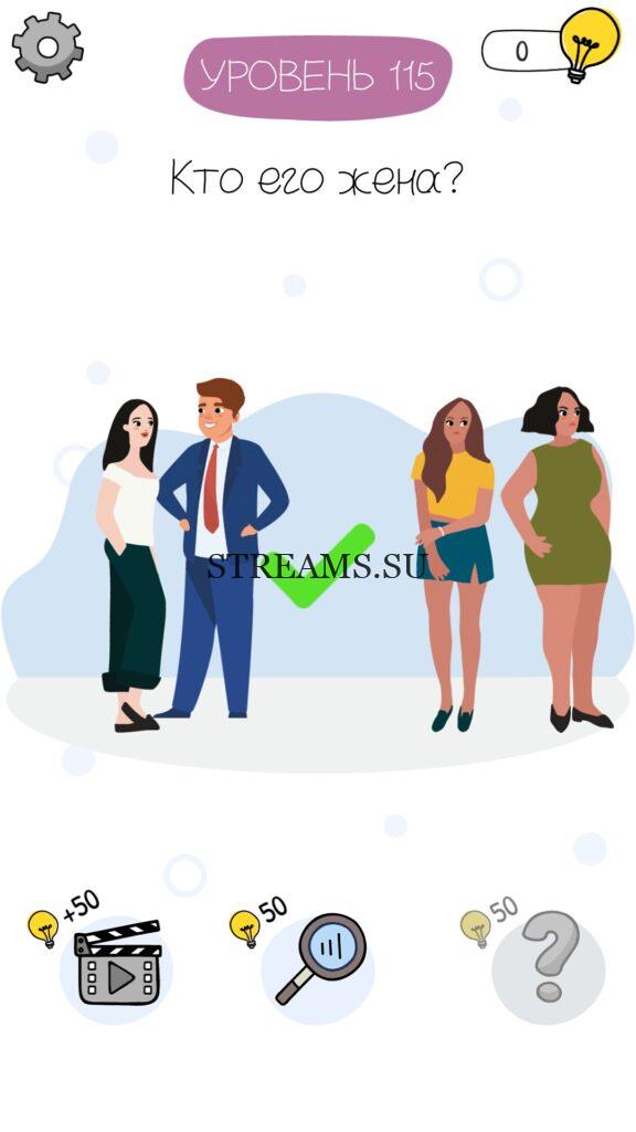 Кто его жена? Уровень 115 — Who is? Головоломки и загадки — это уникальная головоломка, с которой не соскучишься! Если вам понравились такие игры как Brain Test и вторая её часть, то вам придется по вкусу и эта игра. С помощью подсказок, которые нам предстоит найти, нужно проходить уровень за уровнем. С каждым уровнем сложность отгадки будет расти. Поэтому приготовьтесь попотеть, чтобы пройти все уровни. Преимущества этой игры в том, что она работает без интернета! Если у вас не получается пройти один из уровней, то не отчаивайтесь. Вы всегда сможете найти ответы к игре Who is? на нашем замечательном сайте!
