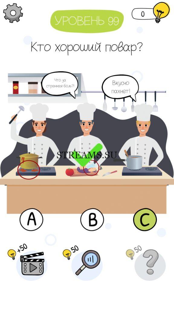 Кто хороший повар? Уровень 99 — Who is? Головоломки и загадки — это уникальная головоломка, с которой не соскучишься! Если вам понравились такие игры как Brain Test и вторая её часть, то вам придется по вкусу и эта игра. С помощью подсказок, которые нам предстоит найти, нужно проходить уровень за уровнем. С каждым уровнем сложность отгадки будет расти. Поэтому приготовьтесь попотеть, чтобы пройти все уровни. Преимущества этой игры в том, что она работает без интернета! Если у вас не получается пройти один из уровней, то не отчаивайтесь. Вы всегда сможете найти ответы к игре Who is? на нашем замечательном сайте!
