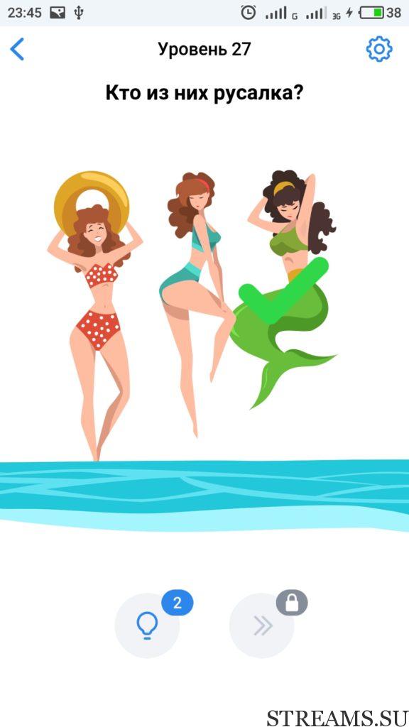 Кто из них русалка? 27 уровень Easy Game — это интересная но в тоже время сложная головоломка, которая заставит вас включить нестандартное мышление. Прокачайте свой мозг и IQ. Почувствуйте себя самым умным, решая захватывающие и заковыристые задачки. Разработчики Easybrain, обещают, что с помощью этой игры вы сможете развить творческие навыки. Но если не сможете пройти какой-нибудь из уровней, то воспользуйтесь ответами с нашего сайта.