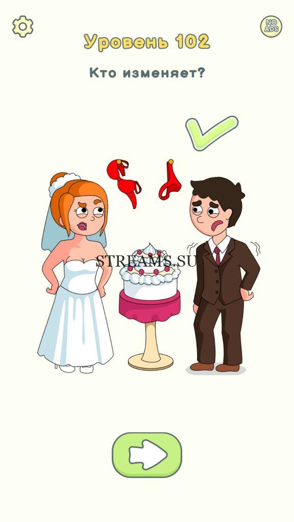 Кто изменяет? Уровень 102 — DOP 2: Delete One Part. Вы готовы к продолжению первой части игры? Тогда вперед! Эта игра DOP 2 (Расшифровка: Delete One Part) , которая отличается от первой части тем, что здесь нам нужно будет не дорисовывать предметы, а удалять или стирать их. Вас ждет множество хитроумных и интересных уровней. На первом этапе нам будут подсказывать, что нужно удали, но потом становится всё тяжелее и тяжелее решать головоломки. Разработчики постарались сделать игру привлекательной. Геймплей заставит вас просидеть за игрой очень долго. Красивая графика исполнения. Тренировка мозга и многое другое, всё это ждет нас в замечательной головоломке DOP 2. Если не получается пройти уровень, или зашли в тупик, то вы можете найти ответ на любой уровень на нашем сайте STREAMS.SU! Ответ на этот уровень находиться чуть ниже..