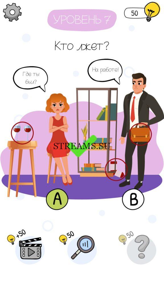 Кто лжет? Уровень 7 — Who is? Головоломки и загадки — это уникальная головоломка, с которой не соскучишься! Если вам понравились такие игры как Brain Test и вторая её часть, то вам придется по вкусу и эта игра. С помощью подсказок, которые нам предстоит найти, нужно проходить уровень за уровнем. С каждым уровнем сложность отгадки будет расти. Поэтому приготовьтесь попотеть, чтобы пройти все уровни. Преимущества этой игры в том, что она работает без интернета! Если у вас не получается пройти один из уровней, то не отчаивайтесь. Вы всегда сможете найти ответы к игре Who is? на нашем замечательном сайте!