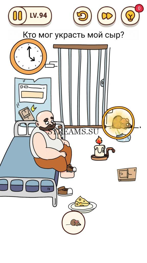 Кто мог украсть мой сыр? Уровень 94 — Brain Find– уникальная игра в жанре «головоломка», ответ находится чуть ниже. Она имеет множество уровней и подуровней, которые весело проходить, без особых усилий и траты нервов. Игра нравится многим пользователям из-за приятного музыкального ряда, сопровождающегося весь игровой процесс. Тонко выполненной анимации и красивой графики, над которой поработали разработчики и вложили душу. Уникальность проекта состоит в том, что можно поворачивать экран на некоторых заданиях, увеличивать громкость динамика. То есть, всецело взаимодействовать не только с дисплеем, но и со всем мобильным устройством. На данный момент таких игр мало и не все они доступны в бесплатной версии! Brain Find переведена на русский язык. На нашем сайте, можно получить подсказки, если не получается пройти дальше.