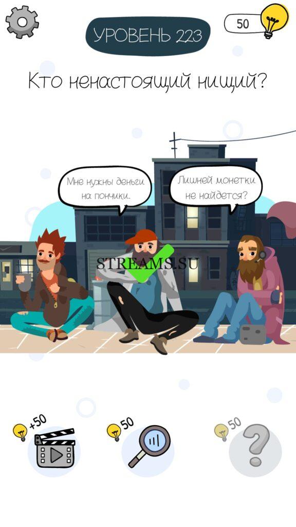 Кто настоящий нищий? Уровень 223 — Who is? Головоломки и загадки — это уникальная головоломка, с которой не соскучишься! Если вам понравились такие игры как Brain Test и вторая её часть, то вам придется по вкусу и эта игра. С помощью подсказок, которые нам предстоит найти, нужно проходить уровень за уровнем. С каждым уровнем сложность отгадки будет расти. Поэтому приготовьтесь попотеть, чтобы пройти все уровни. Преимущества этой игры в том, что она работает без интернета! Если у вас не получается пройти один из уровней, то не отчаивайтесь. Вы всегда сможете найти ответы к игре Who is? на нашем замечательном сайте!