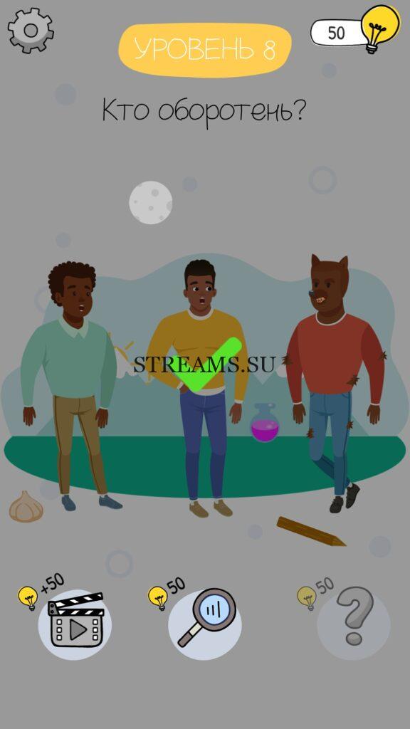 Кто оборотень? Уровень 8 — Who is? Головоломки и загадки — это уникальная головоломка, с которой не соскучишься! Если вам понравились такие игры как Brain Test и вторая её часть, то вам придется по вкусу и эта игра. С помощью подсказок, которые нам предстоит найти, нужно проходить уровень за уровнем. С каждым уровнем сложность отгадки будет расти. Поэтому приготовьтесь попотеть, чтобы пройти все уровни. Преимущества этой игры в том, что она работает без интернета! Если у вас не получается пройти один из уровней, то не отчаивайтесь. Вы всегда сможете найти ответы к игре Who is? на нашем замечательном сайте!