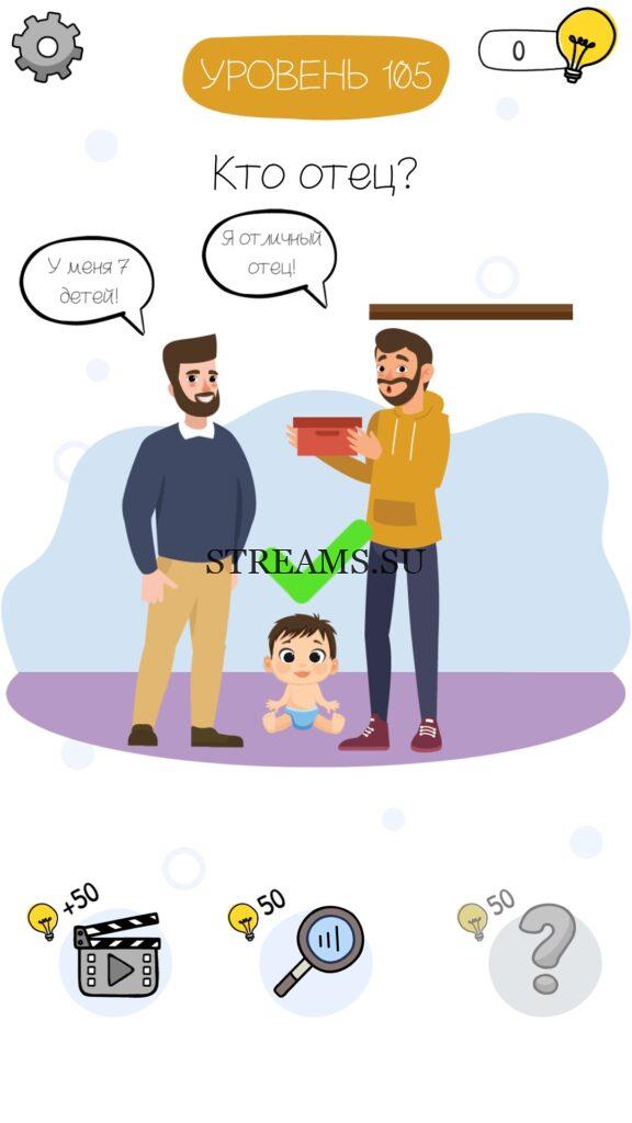 Кто отец? Уровень 105 — Who is? Головоломки и загадки — это уникальная головоломка, с которой не соскучишься! Если вам понравились такие игры как Brain Test и вторая её часть, то вам придется по вкусу и эта игра. С помощью подсказок, которые нам предстоит найти, нужно проходить уровень за уровнем. С каждым уровнем сложность отгадки будет расти. Поэтому приготовьтесь попотеть, чтобы пройти все уровни. Преимущества этой игры в том, что она работает без интернета! Если у вас не получается пройти один из уровней, то не отчаивайтесь. Вы всегда сможете найти ответы к игре Who is? на нашем замечательном сайте!