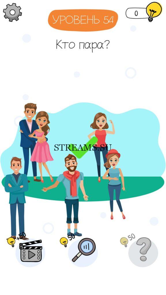 Кто пара? Уровень 54 — Who is? Головоломки и загадки — это уникальная головоломка, с которой не соскучишься! Если вам понравились такие игры как Brain Test и вторая её часть, то вам придется по вкусу и эта игра. С помощью подсказок, которые нам предстоит найти, нужно проходить уровень за уровнем. С каждым уровнем сложность отгадки будет расти. Поэтому приготовьтесь попотеть, чтобы пройти все уровни. Преимущества этой игры в том, что она работает без интернета! Если у вас не получается пройти один из уровней, то не отчаивайтесь. Вы всегда сможете найти ответы к игре Who is? на нашем замечательном сайте!