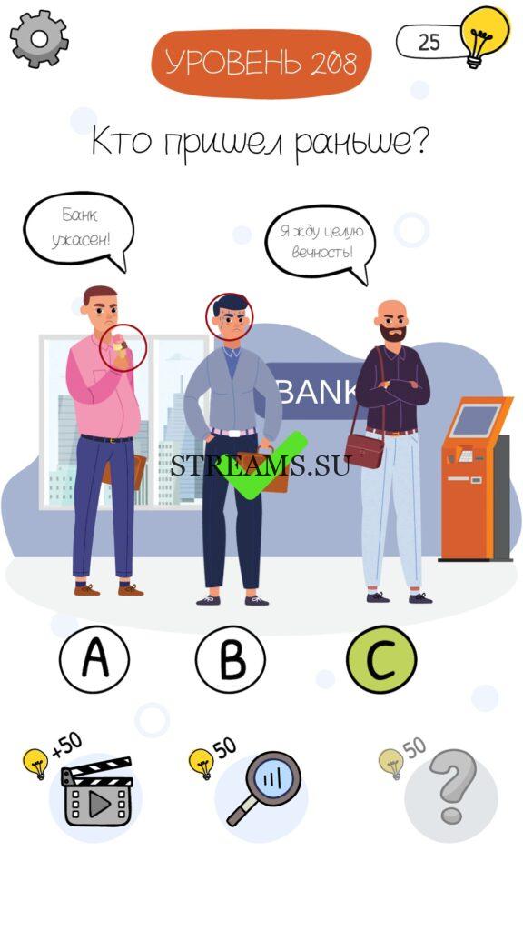 Кто пришел раньше? Уровень 208 — Who is? Головоломки и загадки — это уникальная головоломка, с которой не соскучишься! Если вам понравились такие игры как Brain Test и вторая её часть, то вам придется по вкусу и эта игра. С помощью подсказок, которые нам предстоит найти, нужно проходить уровень за уровнем. С каждым уровнем сложность отгадки будет расти. Поэтому приготовьтесь попотеть, чтобы пройти все уровни. Преимущества этой игры в том, что она работает без интернета! Если у вас не получается пройти один из уровней, то не отчаивайтесь. Вы всегда сможете найти ответы к игре Who is? на нашем замечательном сайте!