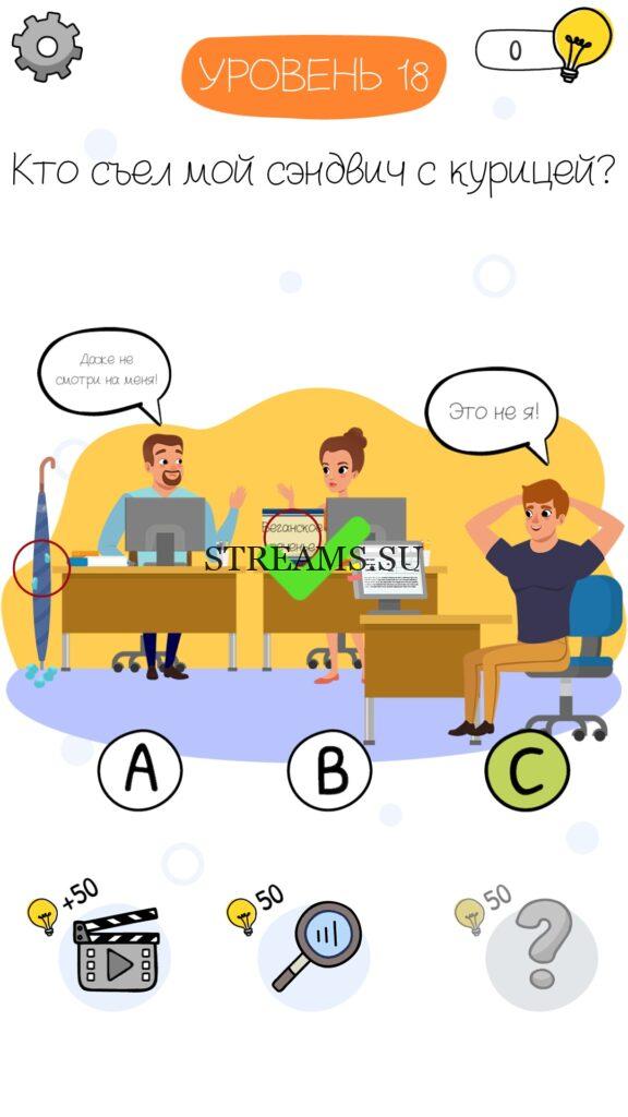 Кто съел мой сэндвич с курицей? Уровень 18 — Who is? Головоломки и загадки — это уникальная головоломка, с которой не соскучишься! Если вам понравились такие игры как Brain Test и вторая её часть, то вам придется по вкусу и эта игра. С помощью подсказок, которые нам предстоит найти, нужно проходить уровень за уровнем. С каждым уровнем сложность отгадки будет расти. Поэтому приготовьтесь попотеть, чтобы пройти все уровни. Преимущества этой игры в том, что она работает без интернета! Если у вас не получается пройти один из уровней, то не отчаивайтесь. Вы всегда сможете найти ответы к игре Who is? на нашем замечательном сайте!