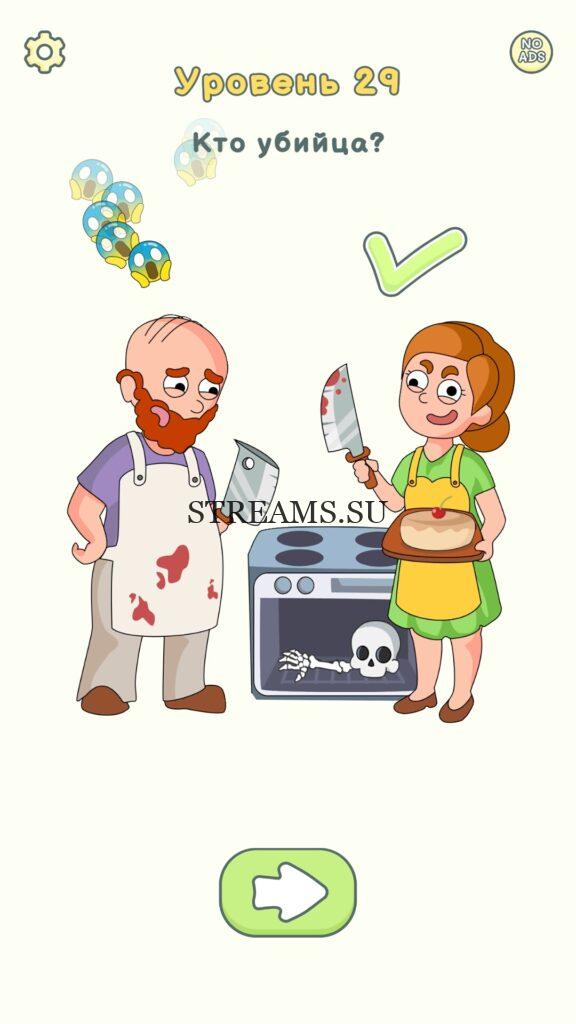 Кто убийца? Уровень 29 — DOP 2: Delete One Part. Вы готовы к продолжению первой части игры? Тогда вперед! Эта игра DOP 2 (Расшифровка: Delete One Part) , которая отличается от первой части тем, что здесь нам нужно будет не дорисовывать предметы, а удалять или стирать их. Вас ждет множество хитроумных и интересных уровней. На первом этапе нам будут подсказывать, что нужно удали, но потом становится всё тяжелее и тяжелее решать головоломки. Разработчики постарались сделать игру привлекательной. Геймплей заставит вас просидеть за игрой очень долго. Красивая графика исполнения. Тренировка мозга и многое другое, всё это ждет нас в замечательной головоломке DOP 2. Если не получается пройти уровень, или зашли в тупик, то вы можете найти ответ на любой уровень на нашем сайте STREAMS.SU! Ответ на этот уровень находиться чуть ниже..