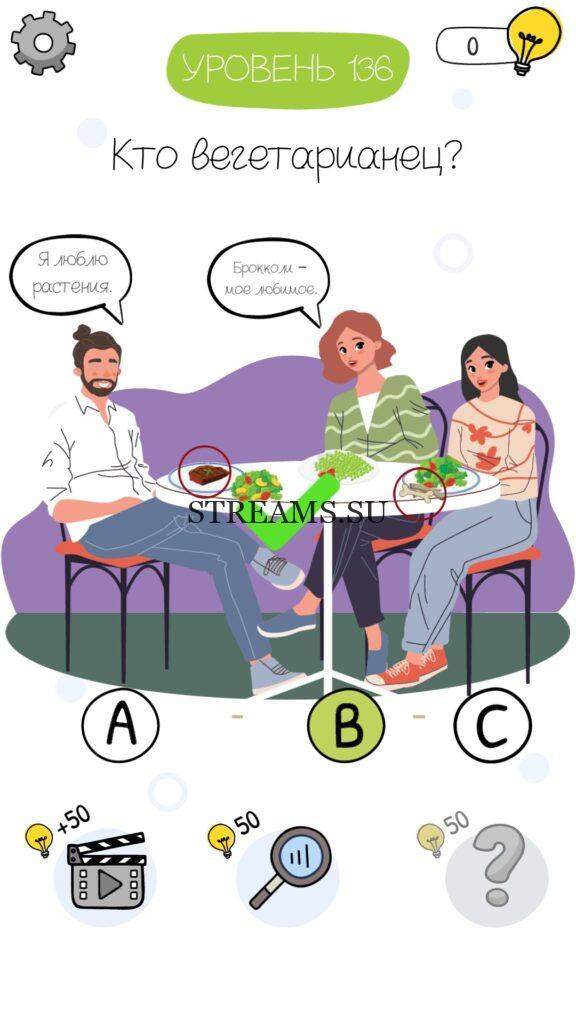 Кто вегетарианец? Уровень 136 — Who is? Головоломки и загадки — это уникальная головоломка, с которой не соскучишься! Если вам понравились такие игры как Brain Test и вторая её часть, то вам придется по вкусу и эта игра. С помощью подсказок, которые нам предстоит найти, нужно проходить уровень за уровнем. С каждым уровнем сложность отгадки будет расти. Поэтому приготовьтесь попотеть, чтобы пройти все уровни. Преимущества этой игры в том, что она работает без интернета! Если у вас не получается пройти один из уровней, то не отчаивайтесь. Вы всегда сможете найти ответы к игре Who is? на нашем замечательном сайте!