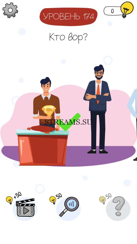 Кто вор? Уровень 174 — Who is? Головоломки и загадки — это уникальная головоломка, с которой не соскучишься! Если вам понравились такие игры как Brain Test и вторая её часть, то вам придется по вкусу и эта игра. С помощью подсказок, которые нам предстоит найти, нужно проходить уровень за уровнем. С каждым уровнем сложность отгадки будет расти. Поэтому приготовьтесь попотеть, чтобы пройти все уровни. Преимущества этой игры в том, что она работает без интернета! Если у вас не получается пройти один из уровней, то не отчаивайтесь. Вы всегда сможете найти ответы к игре Who is? на нашем замечательном сайте!