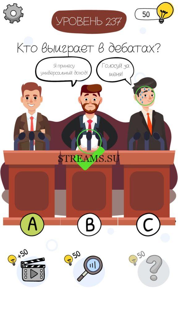 Кто выиграет в дебатах? Уровень 237 — Who is? Головоломки и загадки — это уникальная головоломка, с которой не соскучишься! Если вам понравились такие игры как Brain Test и вторая её часть, то вам придется по вкусу и эта игра. С помощью подсказок, которые нам предстоит найти, нужно проходить уровень за уровнем. С каждым уровнем сложность отгадки будет расти. Поэтому приготовьтесь попотеть, чтобы пройти все уровни. Преимущества этой игры в том, что она работает без интернета! Если у вас не получается пройти один из уровней, то не отчаивайтесь. Вы всегда сможете найти ответы к игре Who is? на нашем замечательном сайте!