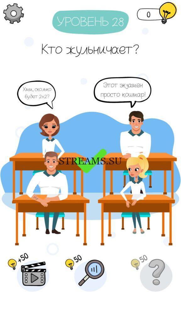 Кто жульничает? Уровень 28 — Who is? Головоломки и загадки — это уникальная головоломка, с которой не соскучишься! Если вам понравились такие игры как Brain Test и вторая её часть, то вам придется по вкусу и эта игра. С помощью подсказок, которые нам предстоит найти, нужно проходить уровень за уровнем. С каждым уровнем сложность отгадки будет расти. Поэтому приготовьтесь попотеть, чтобы пройти все уровни. Преимущества этой игры в том, что она работает без интернета! Если у вас не получается пройти один из уровней, то не отчаивайтесь. Вы всегда сможете найти ответы к игре Who is? на нашем замечательном сайте!