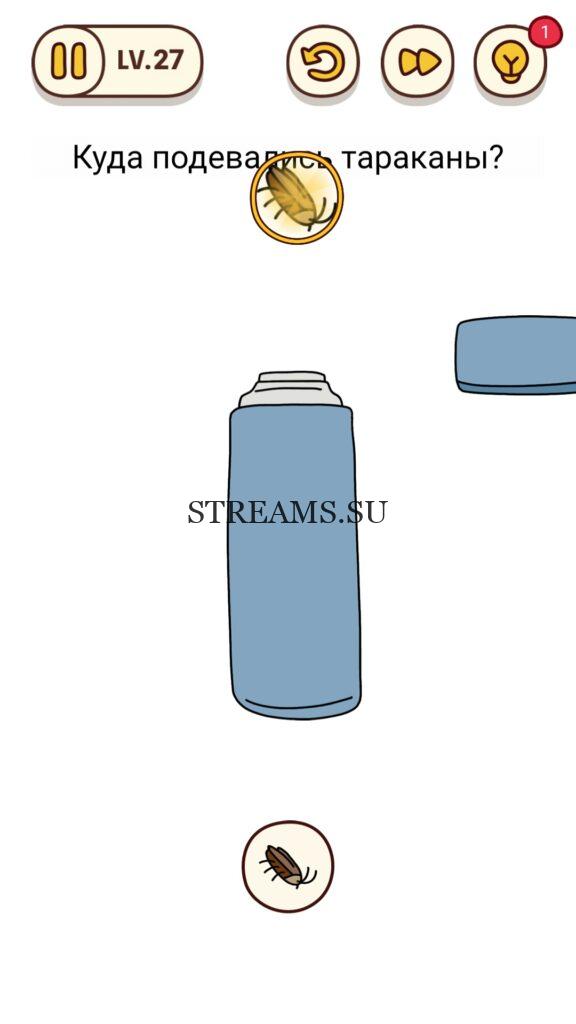 Куда подевались тараканы? Уровень 27 — Brain Find– игра для любителей подумать над интересными задачами, ответ на этот уровень находится чуть ниже. Нужно включить собственное остроумие. Эта игра дает возможность увидеть множество локаций и разгадать бесконечное количество ребусов. Каждый отличается друг от друга. Создатели игры – «Focus apps» вложили не только материальные средства, но и всю любовь к игрокам. Ведь в приложении достаточно совершенная прорисовка, радующая глаз. Главным преимуществом является поддержка как Android так и IOS. Нередко бывает, что человек, проходящий уровень, не способен его решить (задача слишком сложна или непонятна). Наш сайт с ответами поможет игроку достичь вершин рейтинга и заполучить все бонусы.