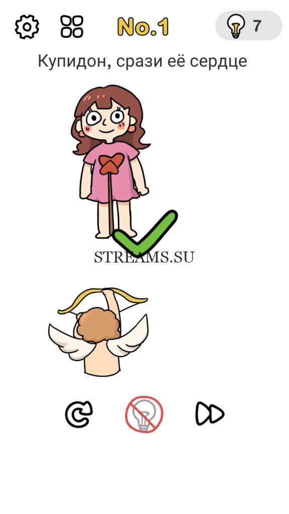 Купидон, срази её сердце. (Победи их всех) Уровень 1 — Brain Out: Ответ на этот уровень находится чуть ниже. Всегда было интересно узнать каков твой IQ? Эта игра поможет тебе узнать ответ на этот вопрос! В ней встречаются как логические загадки, так и не очень. С помощью этой интересной головоломки вы сможете развить нестандартное мышление, креативность, воображение а также улучшить способность запоминать. Некоторые решения задач, могут показаться абсурдными. Играйте в Brain Out с друзьями и родственниками. А если у вас не получается пройти один или несколько уровней, вы можете воспользоваться подсказками с нашего сайта.