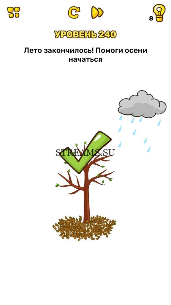 Лето закончилось! Помоги осени начаться. Уровень 240 — Brain Blow: Тест на гениальность — Ответ на этот уровень находится под фото. Очередная игра от популярных разработчиков головоломок CASUAL AZUR GAMES. Если вы хотите взорвать свой мозг и развить навыки нестандартного мышления, тогда игра Брейн Блоу определенно вам понравится. Если не получается решить задание, то попробуйте включить нестандартное мышление, тряхнуть телефон, погладить его или использовать больше пальцев. Эта игра способна развить в вас навыки следопыта, креативность и прокачать ваш IQ. Но, а если все-же не получается пройти уровень, найдите правильное решение на нашем сайте.