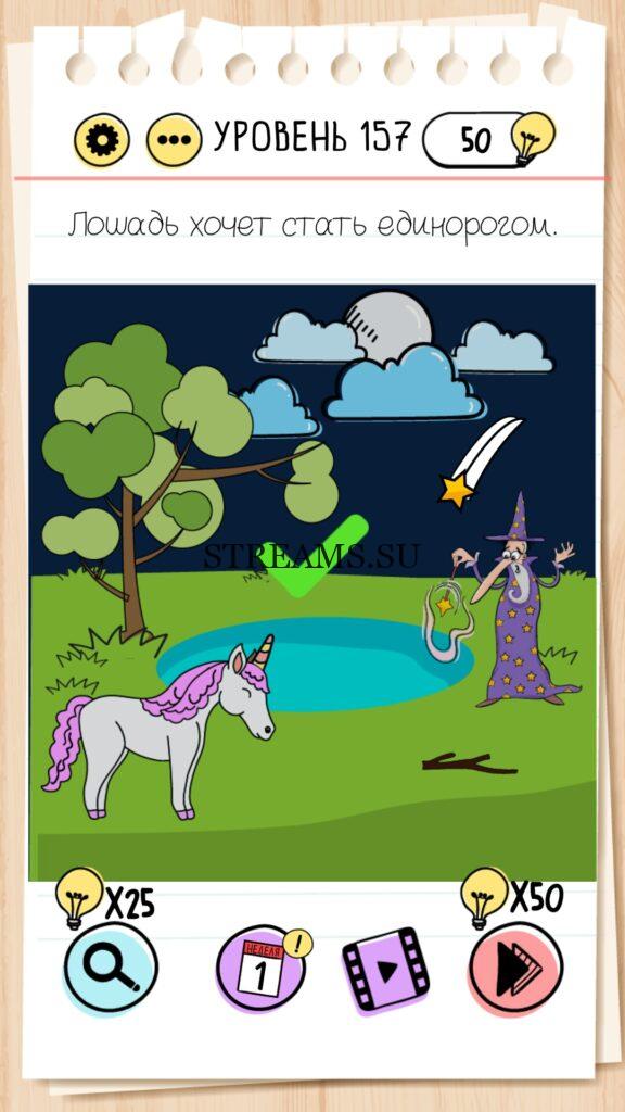 Лошадь хочет стать единорогом. Уровень 157 — Brain Test— Это самая популярная головоломка, в которой вам предстоит разгадывать непростые задачки. Нужно будет искать нестандартные решения. Название игры говорит само за себя (Тест мозга). С её помощью вы сможете повысить свой IQ, и интеллект. Иногда ответ может быть очень прост. Вы можете играть в компании друзей или родных. Брейн Тест, это отличный способ провести время с пользой и узнать насколько ты умный. Но если вы не можете решить один или несколько уровней, то воспользуйтесь подсказками с нашего сайта.