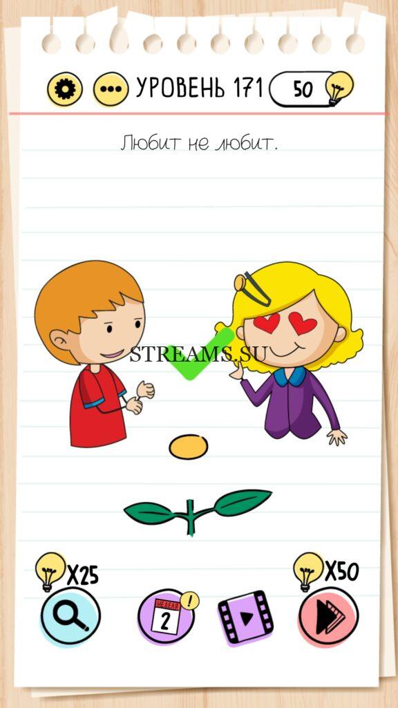 Любит не любит. Уровень 171 — Brain Test— Это самая популярная головоломка, в которой вам предстоит разгадывать непростые задачки. Нужно будет искать нестандартные решения. Название игры говорит само за себя (Тест мозга). С её помощью вы сможете повысить свой IQ, и интеллект. Иногда ответ может быть очень прост. Вы можете играть в компании друзей или родных. Брейн Тест, это отличный способ провести время с пользой и узнать насколько ты умный. Но если вы не можете решить один или несколько уровней, то воспользуйтесь подсказками с нашего сайта.