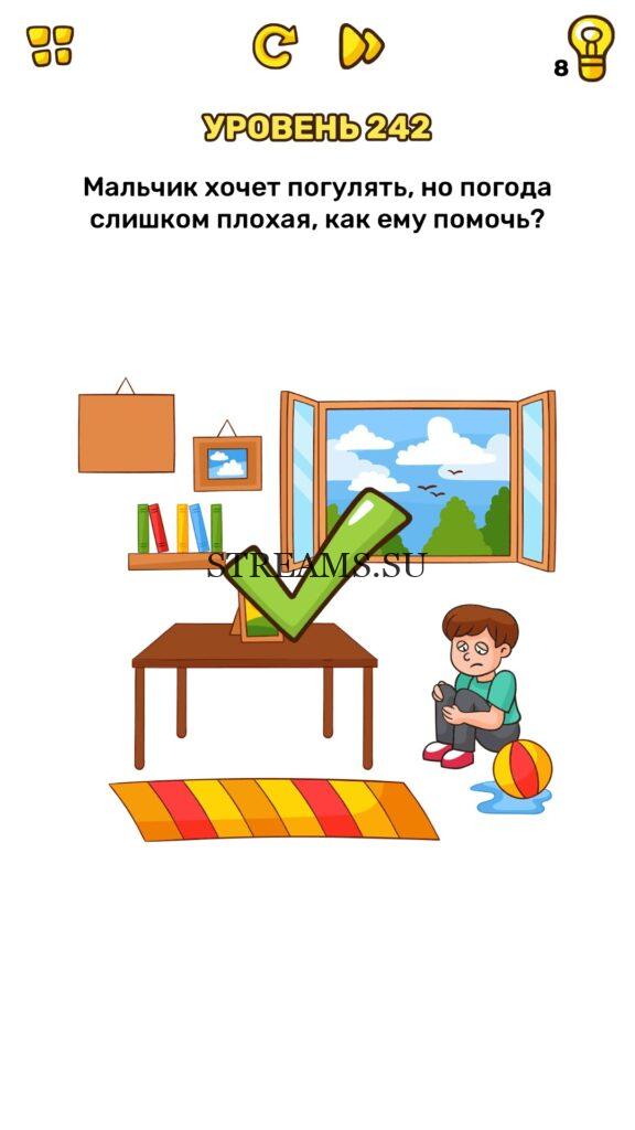 Мальчик хочет погулять, но погода слишком плохая, как ему помочь? Уровень 242 — Brain Blow: Тест на гениальность — Ответ на этот уровень находится под фото. Очередная игра от популярных разработчиков головоломок CASUAL AZUR GAMES. Если вы хотите взорвать свой мозг и развить навыки нестандартного мышления, тогда игра Брейн Блоу определенно вам понравится. Если не получается решить задание, то попробуйте включить нестандартное мышление, тряхнуть телефон, погладить его или использовать больше пальцев. Эта игра способна развить в вас навыки следопыта, креативность и прокачать ваш IQ. Но, а если все-же не получается пройти уровень, найдите правильное решение на нашем сайте.
