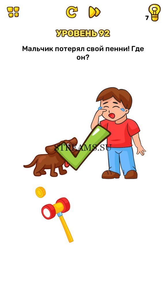 Мальчик потерял свой пенни! Где он? Уровень 92 — Brain Blow: Тест на гениальность — Ответ на этот уровень находится под фото. Очередная игра от популярных разработчиков головоломок CASUAL AZUR GAMES. Если вы хотите взорвать свой мозг и развить навыки нестандартного мышления, тогда игра Брейн Блоу определенно вам понравится. Если не получается решить задание, то попробуйте включить нестандартное мышление, тряхнуть телефон, погладить его или использовать больше пальцев. Эта игра способна развить в вас навыки следопыта, креативность и прокачать ваш IQ. Но, а если все-же не получается пройти уровень, найдите правильное решение на нашем сайте.