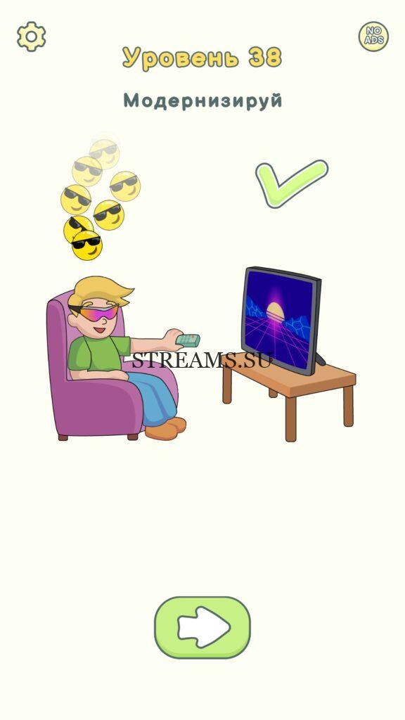 Модернизируй. Уровень 38 — DOP 2: Delete One Part. Вы готовы к продолжению первой части игры? Тогда вперед! Эта игра DOP 2 (Расшифровка: Delete One Part) , которая отличается от первой части тем, что здесь нам нужно будет не дорисовывать предметы, а удалять или стирать их. Вас ждет множество хитроумных и интересных уровней. На первом этапе нам будут подсказывать, что нужно удали, но потом становится всё тяжелее и тяжелее решать головоломки. Разработчики постарались сделать игру привлекательной. Геймплей заставит вас просидеть за игрой очень долго. Красивая графика исполнения. Тренировка мозга и многое другое, всё это ждет нас в замечательной головоломке DOP 2. Если не получается пройти уровень, или зашли в тупик, то вы можете найти ответ на любой уровень на нашем сайте STREAMS.SU! Ответ на этот уровень находиться чуть ниже..