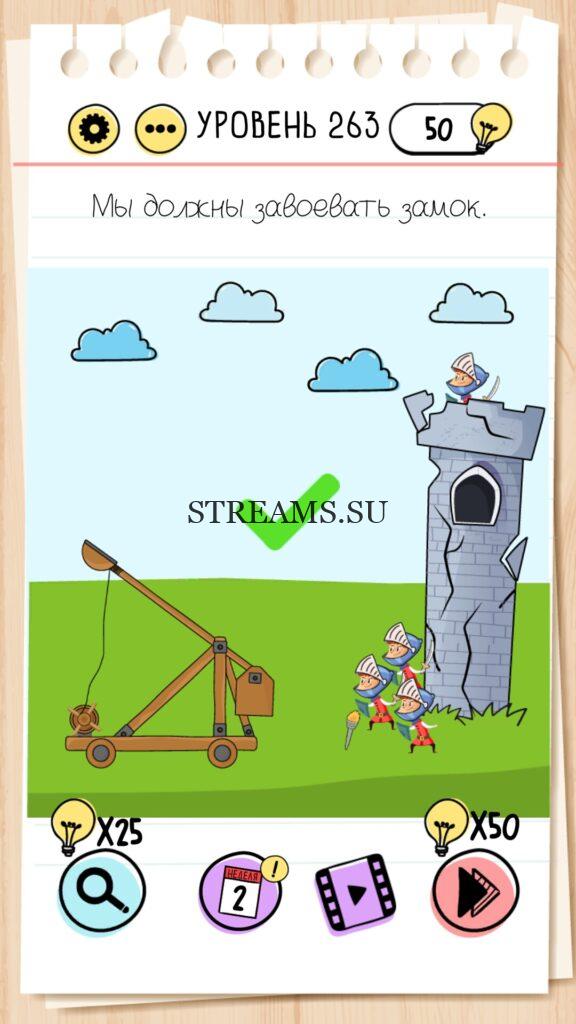 Мы должны завоевать замок. Уровень 263 — Brain Test — Это самая популярная головоломка, в которой вам предстоит разгадывать непростые задачки. Нужно будет искать нестандартные решения. Название игры говорит само за себя (Тест мозга). С её помощью вы сможете повысить свой IQ, и интеллект. Иногда ответ может быть очень прост. Вы можете играть в компании друзей или родных. Брейн Тест, это отличный способ провести время с пользой и узнать насколько ты умный. Но если вы не можете решить один или несколько уровней, то воспользуйтесь подсказками с нашего сайта.
