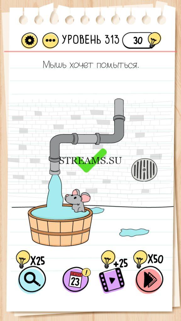 Мышь хочет помыться. Уровень 313 — Brain Test — Это самая популярная головоломка, в которой вам предстоит разгадывать непростые задачки. Нужно будет искать нестандартные решения. Название игры говорит само за себя (Тест мозга). С её помощью вы сможете повысить свой IQ, и интеллект. Иногда ответ может быть очень прост. Вы можете играть в компании друзей или родных. Брейн Тест, это отличный способ провести время с пользой и узнать насколько ты умный. Но если вы не можете решить один или несколько уровней, то воспользуйтесь подсказками с нашего сайта.