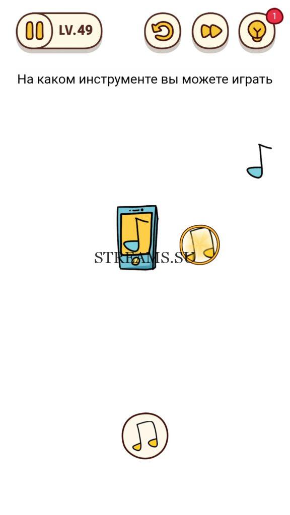 На каком инструменте вы можете играть. Уровень 49 — Brain Find – игра для любителей подумать над интересными задачами, ответ на этот уровень находится чуть ниже. Нужно включить собственное остроумие. Эта игра дает возможность увидеть множество локаций и разгадать бесконечное количество ребусов. Каждый отличается друг от друга. Создатели игры – «Focus apps» вложили не только материальные средства, но и всю любовь к игрокам. Ведь в приложении достаточно совершенная прорисовка, радующая глаз. Главным преимуществом является поддержка как Android так и IOS. Нередко бывает, что человек, проходящий уровень, не способен его решить (задача слишком сложна или непонятна). Наш сайт с ответами поможет игроку достичь вершин рейтинга и заполучить все бонусы.