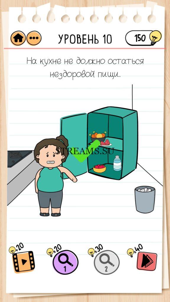 На кухне не должно остаться нездоровой пищи. Уровень 10 — Brain Test 2 (Худеем с Настей): Вторая часть замечательной игры уже здесь. Готовы к испытанию своего мозга на прочность? Тогда смело залетайте в эту головоломку. Здесь нас ждет непредсказуемые задачки, вопросы и головоломки, которые сразу и не получиться решить. Будьте готовы к вопросам с подвохом! Попробуйте решить все уровни. Эта головоломка построена по принципу историй. В каждой истории придется помогать кому-то решить бытовые вопросы; вычислить преступника; помочь похудеть. Это лишь некоторые эпизоды которые нас ожидают в этой игре. Очень красочная игра, которая понравится и вам и вашим друзьям. Если не получается пройти загадку, то на нашем сайте STREAMS.SU вы найдете решение любого уровня Brain Test 2!
