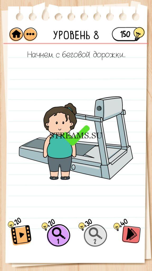 Начнем с беговой дорожки. Уровень 8 — Brain Test 2 (Худеем с Настей): Вторая часть замечательной игры уже здесь. Готовы к испытанию своего мозга на прочность? Тогда смело залетайте в эту головоломку. Здесь нас ждет непредсказуемые задачки, вопросы и головоломки, которые сразу и не получиться решить. Будьте готовы к вопросам с подвохом! Попробуйте решить все уровни. Эта головоломка построена по принципу историй. В каждой истории придется помогать кому-то решить бытовые вопросы; вычислить преступника; помочь похудеть. Это лишь некоторые эпизоды которые нас ожидают в этой игре. Очень красочная игра, которая понравится и вам и вашим друзьям. Если не получается пройти загадку, то на нашем сайте STREAMS.SU вы найдете решение любого уровня Brain Test 2!