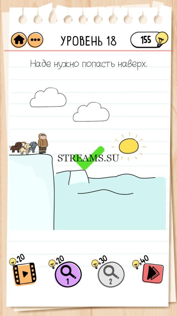 Наде нужно попасть наверх. Уровень 18 — Brain Test 2 (Невезучая Надя): Вторая часть замечательной игры уже здесь. Готовы к испытанию своего мозга на прочность? Тогда смело залетайте в эту головоломку. Здесь нас ждет непредсказуемые задачки, вопросы и головоломки, которые сразу и не получиться решить. Будьте готовы к вопросам с подвохом! Попробуйте решить все уровни. Эта головоломка построена по принципу историй. В каждой истории придется помогать кому-то решить бытовые вопросы; вычислить преступника; помочь похудеть. Это лишь некоторые эпизоды которые нас ожидают в этой игре. Очень красочная игра, которая понравится и вам и вашим друзьям. Если не получается пройти загадку, то на нашем сайте STREAMS.SU вы найдете решение любого уровня Brain Test 2!