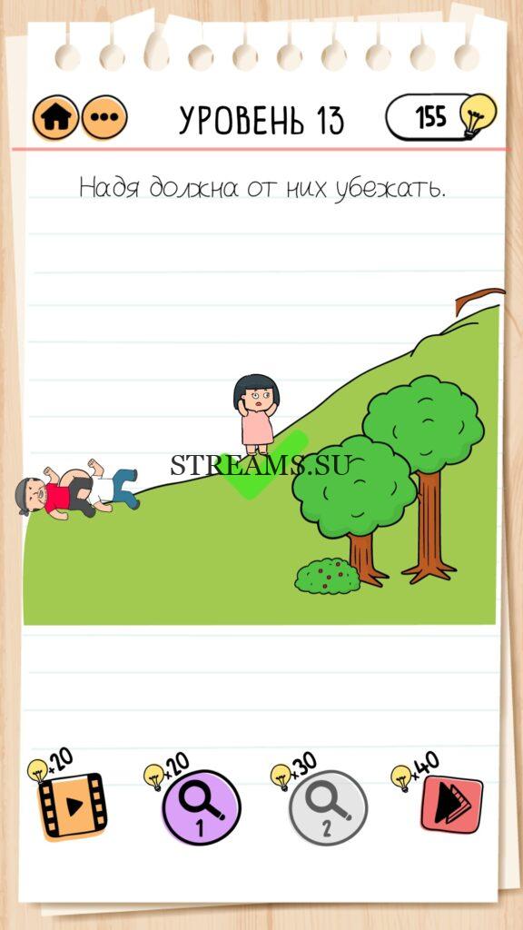 Надя должна от них убежать. Уровень 13 — Brain Test 2 (Невезучая Надя): Вторая часть замечательной игры уже здесь. Готовы к испытанию своего мозга на прочность? Тогда смело залетайте в эту головоломку. Здесь нас ждет непредсказуемые задачки, вопросы и головоломки, которые сразу и не получиться решить. Будьте готовы к вопросам с подвохом! Попробуйте решить все уровни. Эта головоломка построена по принципу историй. В каждой истории придется помогать кому-то решить бытовые вопросы; вычислить преступника; помочь похудеть. Это лишь некоторые эпизоды которые нас ожидают в этой игре. Очень красочная игра, которая понравится и вам и вашим друзьям. Если не получается пройти загадку, то на нашем сайте STREAMS.SU вы найдете решение любого уровня Brain Test 2!