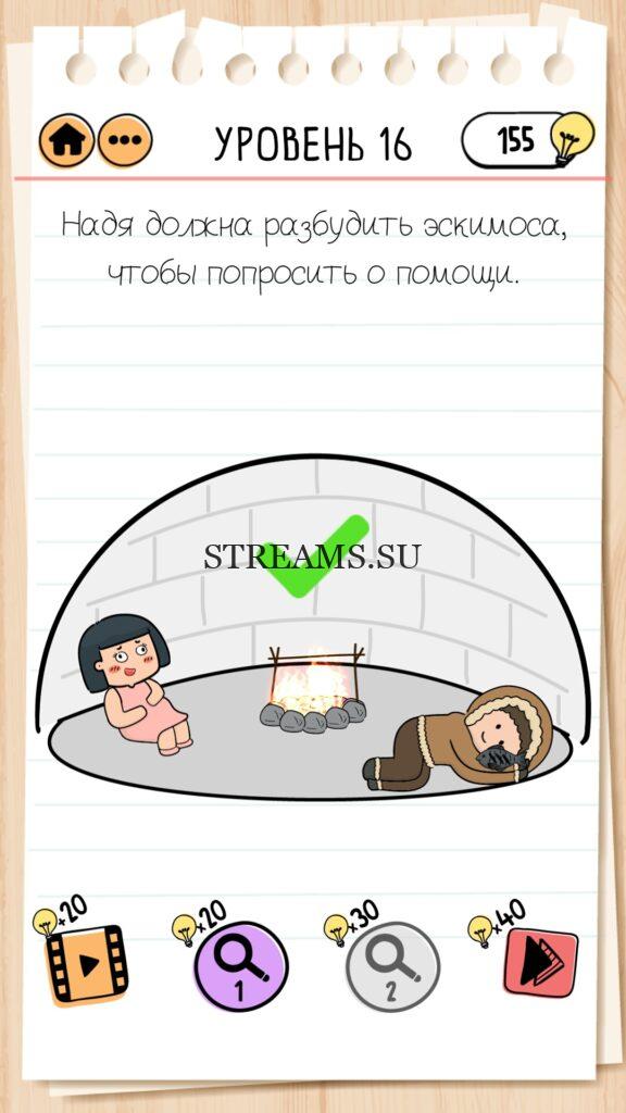 Надя должна разбудить эскимоса, чтобы попросить о помощи. Уровень 16 — Brain Test 2 (Невезучая Надя): Вторая часть замечательной игры уже здесь. Готовы к испытанию своего мозга на прочность? Тогда смело залетайте в эту головоломку. Здесь нас ждет непредсказуемые задачки, вопросы и головоломки, которые сразу и не получиться решить. Будьте готовы к вопросам с подвохом! Попробуйте решить все уровни. Эта головоломка построена по принципу историй. В каждой истории придется помогать кому-то решить бытовые вопросы; вычислить преступника; помочь похудеть. Это лишь некоторые эпизоды которые нас ожидают в этой игре. Очень красочная игра, которая понравится и вам и вашим друзьям. Если не получается пройти загадку, то на нашем сайте STREAMS.SU вы найдете решение любого уровня Brain Test 2!