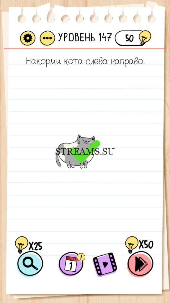Накорми кота слева направо. Уровень 147 — Brain Test— Это самая популярная головоломка, в которой вам предстоит разгадывать непростые задачки. Нужно будет искать нестандартные решения. Название игры говорит само за себя (Тест мозга). С её помощью вы сможете повысить свой IQ, и интеллект. Иногда ответ может быть очень прост. Вы можете играть в компании друзей или родных. Брейн Тест, это отличный способ провести время с пользой и узнать насколько ты умный. Но если вы не можете решить один или несколько уровней, то воспользуйтесь подсказками с нашего сайта.