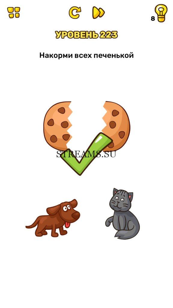 Накорми всех печенькой. Уровень 223 — Brain Blow: Тест на гениальность — Ответ на этот уровень находится под фото. Очередная игра от популярных разработчиков головоломок CASUAL AZUR GAMES. Если вы хотите взорвать свой мозг и развить навыки нестандартного мышления, тогда игра Брейн Блоу определенно вам понравится. Если не получается решить задание, то попробуйте включить нестандартное мышление, тряхнуть телефон, погладить его или использовать больше пальцев. Эта игра способна развить в вас навыки следопыта, креативность и прокачать ваш IQ. Но, а если все-же не получается пройти уровень, найдите правильное решение на нашем сайте.