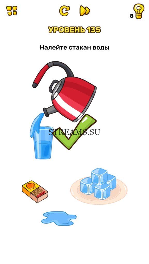 Налейте стакан воды. Уровень 135 — Brain Blow: Тест на гениальность — Ответ на этот уровень находится под фото. Очередная игра от популярных разработчиков головоломок CASUAL AZUR GAMES. Если вы хотите взорвать свой мозг и развить навыки нестандартного мышления, тогда игра Брейн Блоу определенно вам понравится. Если не получается решить задание, то попробуйте включить нестандартное мышление, тряхнуть телефон, погладить его или использовать больше пальцев. Эта игра способна развить в вас навыки следопыта, креативность и прокачать ваш IQ. Но, а если все-же не получается пройти уровень, найдите правильное решение на нашем сайте.