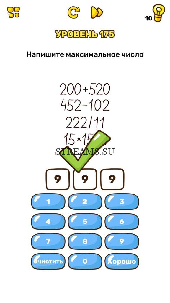 Напишите максимальное число. Уровень 175 — Brain Blow: Тест на гениальность — Ответ на этот уровень находится под фото. Очередная игра от популярных разработчиков головоломок CASUAL AZUR GAMES. Если вы хотите взорвать свой мозг и развить навыки нестандартного мышления, тогда игра Брейн Блоу определенно вам понравится. Если не получается решить задание, то попробуйте включить нестандартное мышление, тряхнуть телефон, погладить его или использовать больше пальцев. Эта игра способна развить в вас навыки следопыта, креативность и прокачать ваш IQ. Но, а если все-же не получается пройти уровень, найдите правильное решение на нашем сайте.