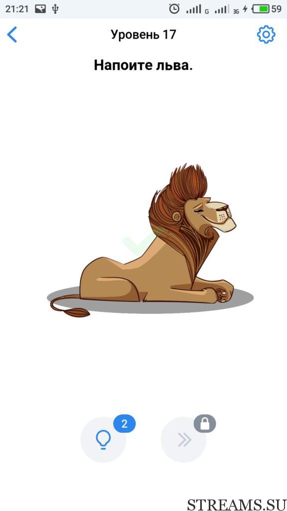 Напоите льва. 17 уровень Easy Game — это интересная но в тоже время сложная головоломка, которая заставит вас включить нестандартное мышление. Прокачайте свой мозг и IQ. Почувствуйте себя самым умным, решая захватывающие и заковыристые задачки. Разработчики Easybrain, обещают, что с помощью этой игры вы сможете развить творческие навыки. Но если не сможете пройти какой-нибудь из уровней, то воспользуйтесь ответами с нашего сайта.