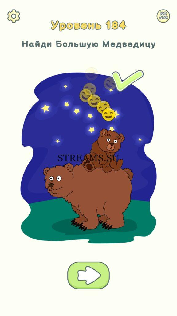 Найди Большую Медведицу. Уровень 184 — DOP 2: Delete One Part. Вы готовы к продолжению первой части игры? Тогда вперед! Эта игра DOP 2 (Расшифровка: Delete One Part) , которая отличается от первой части тем, что здесь нам нужно будет не дорисовывать предметы, а удалять или стирать их. Вас ждет множество хитроумных и интересных уровней. На первом этапе нам будут подсказывать, что нужно удали, но потом становится всё тяжелее и тяжелее решать головоломки. Разработчики постарались сделать игру привлекательной. Геймплей заставит вас просидеть за игрой очень долго. Красивая графика исполнения. Тренировка мозга и многое другое, всё это ждет нас в замечательной головоломке DOP 2. Если не получается пройти уровень, или зашли в тупик, то вы можете найти ответ на любой уровень на нашем сайте STREAMS.SU! Ответ на этот уровень находиться чуть ниже..