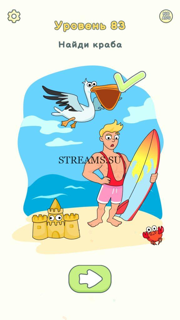 Найди краба. Уровень 83 — DOP 2: Delete One Part. Вы готовы к продолжению первой части игры? Тогда вперед! Эта игра DOP 2 (Расшифровка: Delete One Part) , которая отличается от первой части тем, что здесь нам нужно будет не дорисовывать предметы, а удалять или стирать их. Вас ждет множество хитроумных и интересных уровней. На первом этапе нам будут подсказывать, что нужно удали, но потом становится всё тяжелее и тяжелее решать головоломки. Разработчики постарались сделать игру привлекательной. Геймплей заставит вас просидеть за игрой очень долго. Красивая графика исполнения. Тренировка мозга и многое другое, всё это ждет нас в замечательной головоломке DOP 2. Если не получается пройти уровень, или зашли в тупик, то вы можете найти ответ на любой уровень на нашем сайте STREAMS.SU! Ответ на этот уровень находиться чуть ниже..